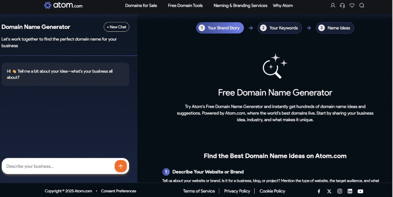 Some tools now use AI to simplify this step. They analyze keywords, context, and language patterns to suggest names that sound relevant and easy to remember. For example, Atom’s Domain Name Generator uses AI to create domain name ideas, checking their availability instantly and helping users find brandable options that fit their goals.