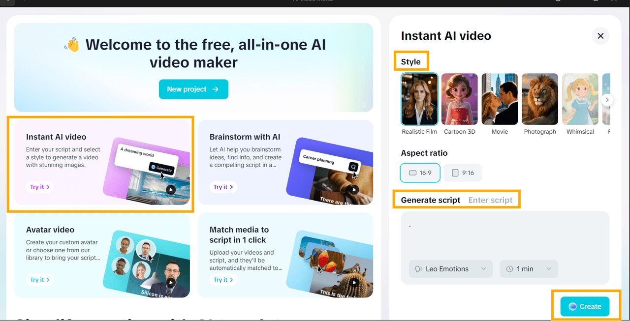 You may use various appearances such as cartoons, cinema look, 3D look, or fun look, which can be used depending on your brand or your own personal look. AI also helps with the script. It is able to create a storyboard on your subject or can improve your current script to make it natural.