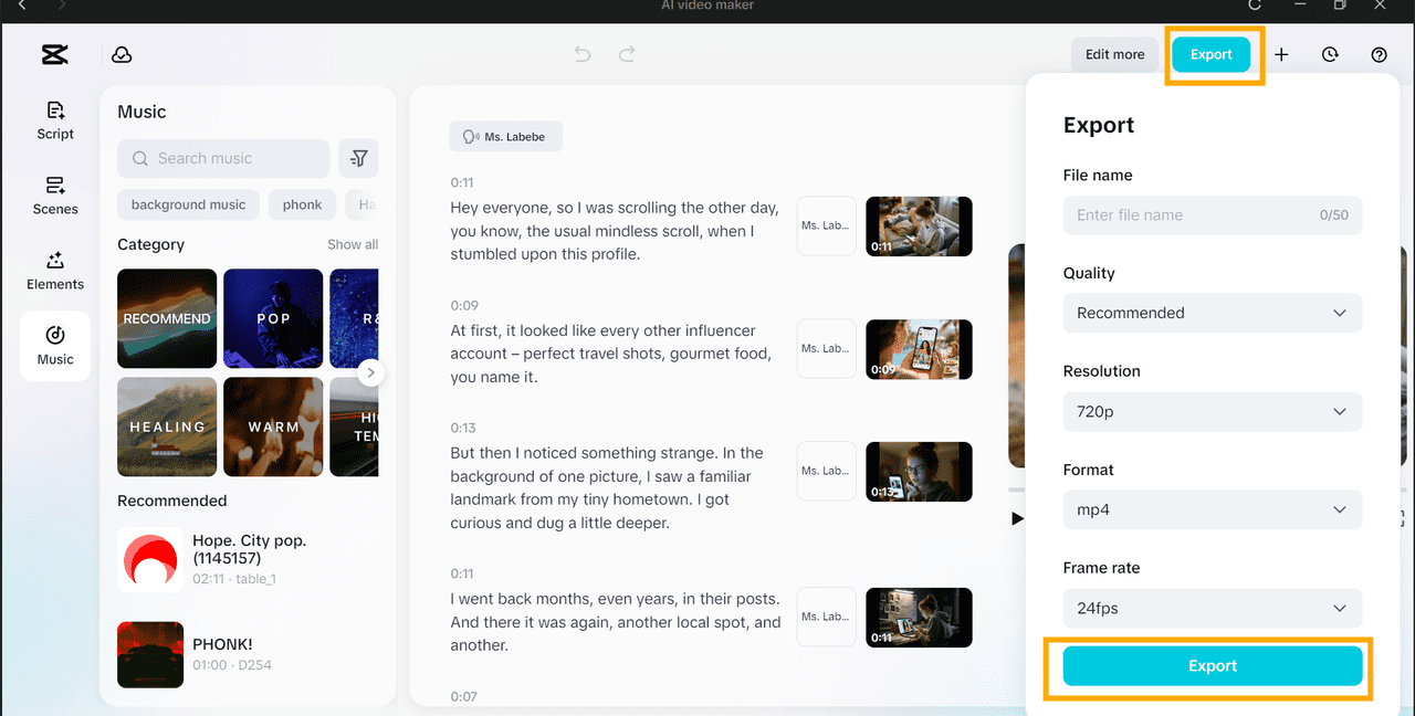 Ensure that the story is flowing properly, captions are accurate, and all the effects are in sync with the music. When you export your video, it will already be ready to upload to any social media and will appear professional and smooth.