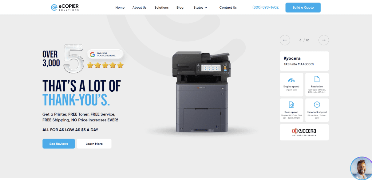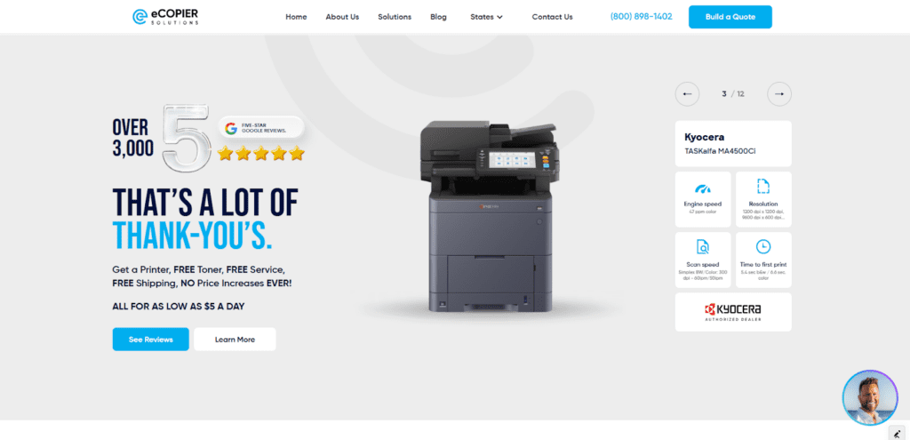 More than 3,000 verified customer reviews do not happen by accident. They happen when a company is obsessive about every single delivery. eCopier Solutions put social proof front and center, not buried in a footer or hidden on a testimonials page. By the time a prospect finishes reading their homepage, the trust question has already been answered. Confidence before conversation.