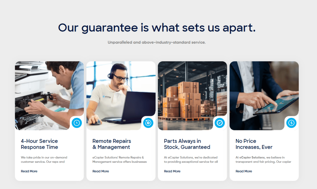 Most companies in this space use price as a weapon. eCopier Solutions uses it as a statement. Their pricing is not just competitive, it is clear. Accessible numbers, no surprise fees, no confusion. Messaging like “$5 a day” strips away the anxiety of B2B purchasing entirely. When your prospect can explain your offer to their boss in one sentence, you have already won half the sale. They did not go cheap. They went clear.