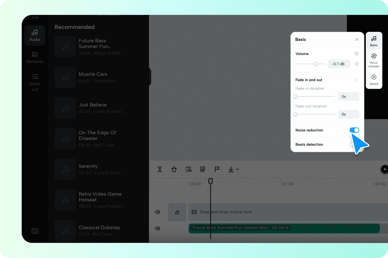 Use background music embedding tools to layer royalty-free tracks behind your voice. Built-in fade-in and fade-out features give your audio that seamless professional finish.